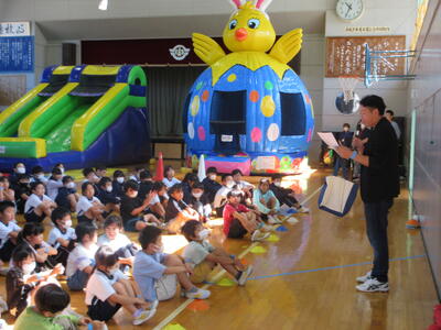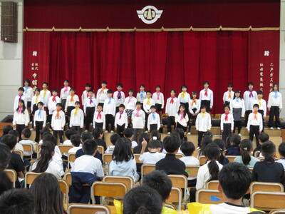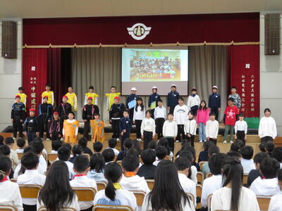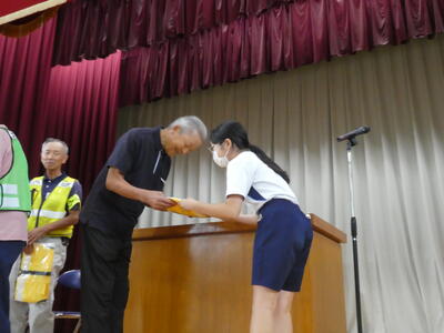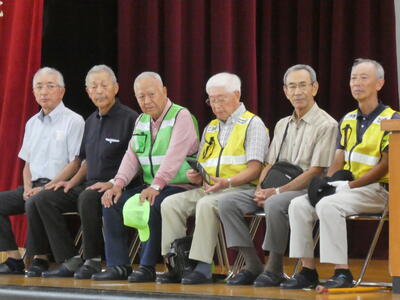 9月の全校朝会に学区のスクールガードの方をお招きして、市から新しく配布されたスクールガード用ベストの贈呈を行いました。代表児童が、日頃の見守り活動へのお礼を述べた後、6名のスクールガードの方へ、ベストを手渡しました。見守り活動への感謝の気持ちを元気な挨拶で表現できる児童が増えることを期待しています。
