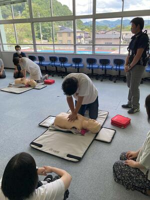 夏休み中のプール開放に伴って、プール監視当番の方々を中心とした水上安全講習会を7月22日(火)に開催しました。二戸消防署の方々を講師としてお招きし、一次救命処置の手順を教わりました。万が一の事態に備え、「命を守る」行動について参加者全員で確認することができました。
