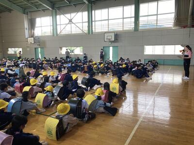 集団下校訓練を行いました。全校で体育館に集合し、初めに班ごとに自己紹介を行いました。次に、担当者から、下校訓練のねらいについての話を聞き、その後、学校から遠い班から順番に集団下校を行いました。下校途中には、いつものようにスクールガードの皆さんが見守りをしていただいていました。