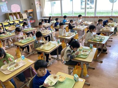 1年生は、小学校での初めての給食でした。担任の先生から給食の準備の仕方や待ち方を教えてもらい、いよいよみんなで手を合わせ「いただきます!」。どの子も笑顔で給食を食べていました。
