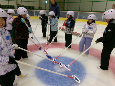 中央小学校では、冬季運動の一つとしてカーリングの体験学習を行っています。
